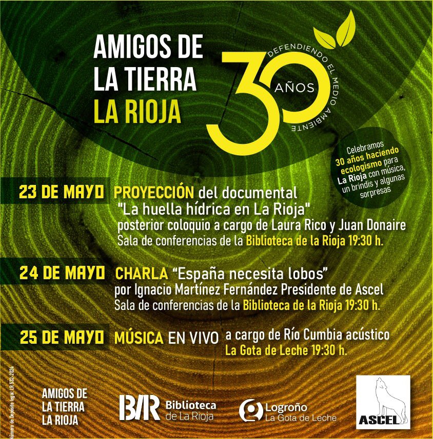 Este mes Amigos de La Tierra La Rioja celebra 30 años de la fundación de la asociación. Quieren celebrar este aniversario con la realización de una serie de actividades de gran interés para el conjunto de la sociedad, que van desde el agua hasta la protección del lobo finalizando con una fiesta.