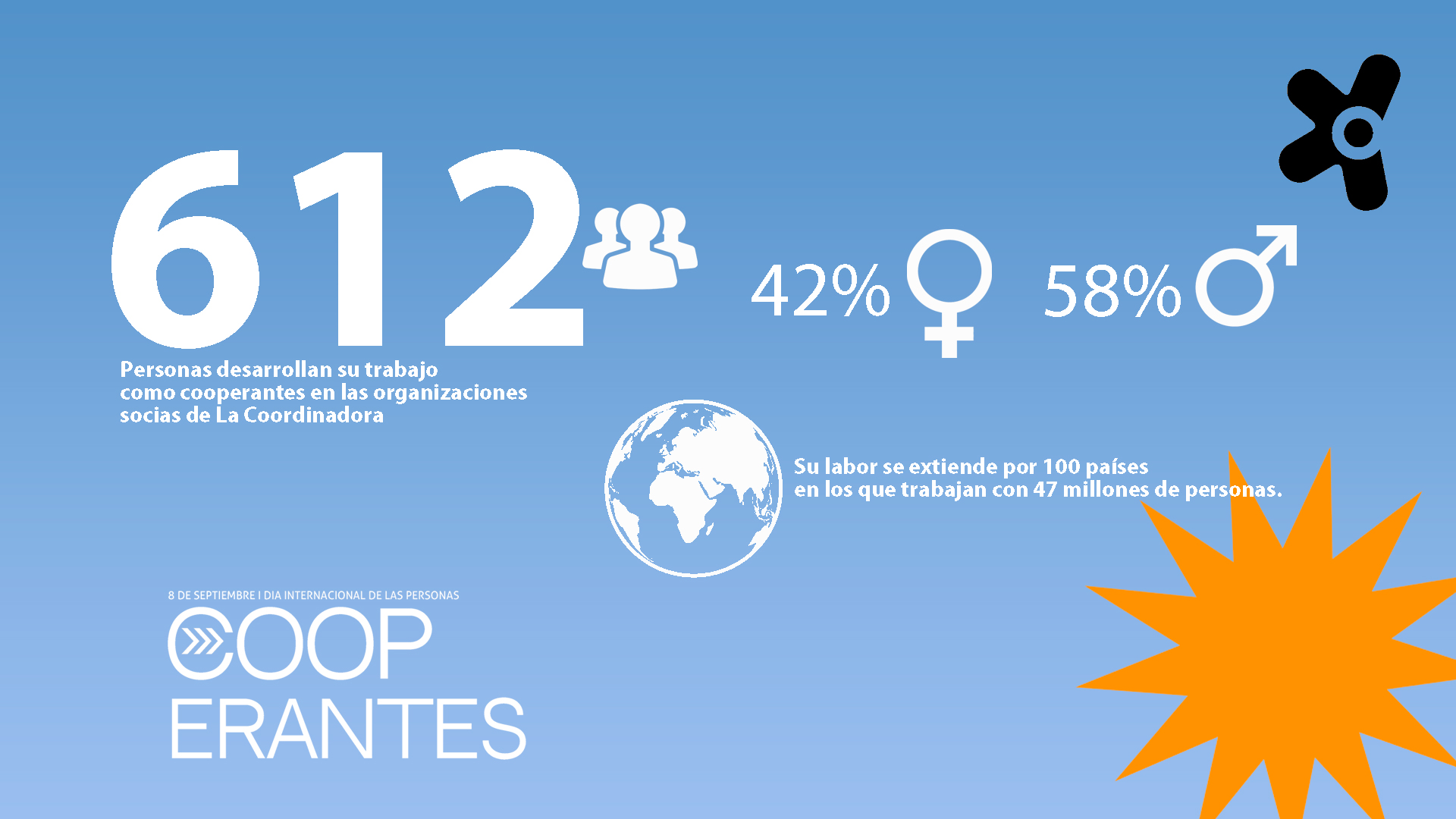 Según el último informe de La Coordinadora de Organizaciones para el Desarrollo, 612 personas (58% hombres, 42% mujeres) desarrollan su trabajo como cooperantes en las organizaciones socias de La Coordinadora.