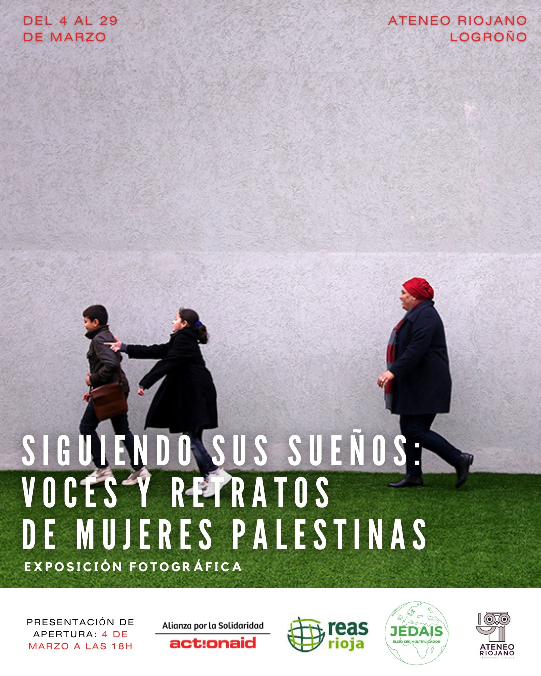 El 4 de marzo a las 18:00 horas es la presentación de apertura de la exposición fotográfica "Siguiendo sus sueños: Voces y retratos de mujeres palestinas", que va a estar en el Ateneo Riojano (Calle Muro de Cervantes 1, Logroño), durante todo el mes de marzo. Durante la apertura también habrá una visita guiada a la exposición.